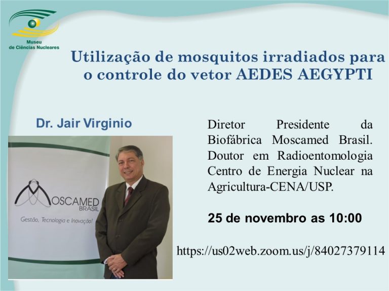 Hoje (25/11/2020), aconteceu o Webnário sobre a Técnica do Inseto Estéril aplicada ao controle do vetor Aedes aegypti, com uma palestra do Dr Jair Virginio. O evento foi realizado pelo Museu de Ciências Nucleares, dirigido pela Profa Dra Helen Khoury. A palestra faz parte da estratégia de Esclarecimento Público do Projeto Aedes Estéril-PAE, desenvolvido pela Moscamed Brasil, e apoiado pela Secretaria de Saúde da Cidade do Recife e pelo Ministério da Saúde, em parceria com a Agência Internacional de Energia Atômica e o Departamento de Energia Nuclear/UFPE