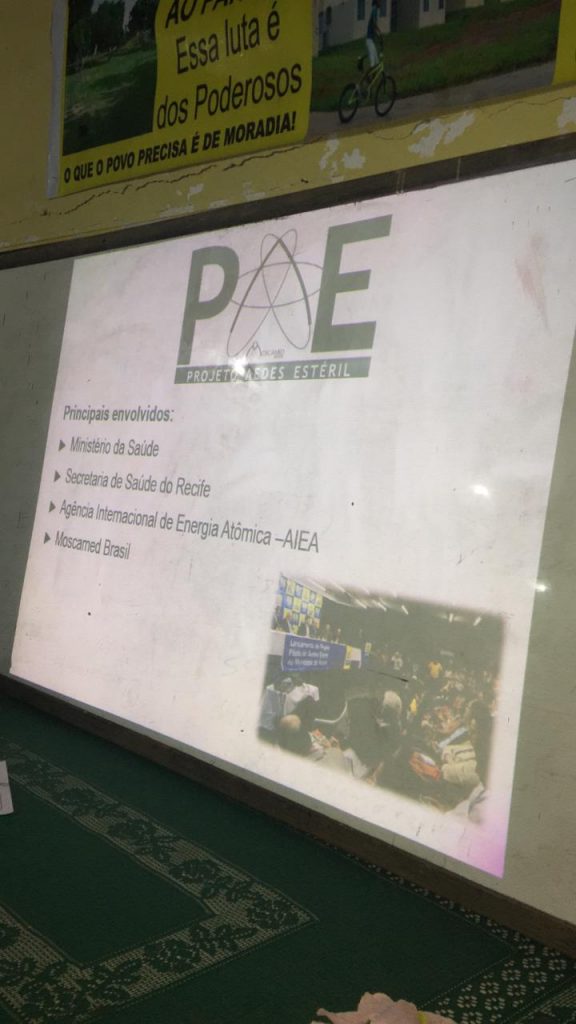 No dia 05/06/19, ocorreu uma reunião de esclarecimento público no bairro Brasília Teimosa na cidade do Recife, com a finalidade de apresentar o Projeto Aedes Estéril (PAE) à comunidade. A abertura da reunião foi realizada pelo Líder do Conselho de Moradores de Brasília Teimosa, Sr. Wilson Lapa. Nessa reunião compareceram mais de de 100 moradores . Na ocasião, a Diretora de Vigilância em Saúde do Distrito Sanitário VI, Sra. Maria Eugênia Farias, apresentou a problemática do mosquito Aedes aegypti nessa localidade, bem como as ações desenvolvidas pela prefeitura no bairro. Também esteve presente a Sra. Jaqueline Nipo da Silva Bezerra, da Coordenação de Vigilância Ambiental do Distrito Sanitário VI.Em seguida, as técnicas da Moscamed, MSc. Fabiane Aragão Rodrigues e MSc. Luiza Garziera apresentaram os objetivos, estratégias e etapas (monitoramento, produção e liberação de machos estéreis) do projeto PAE. Ambas explanaram ainda, sobre a importância da participação da comunidade no projeto, para se obter a supressão populacional do vetor. Durante a reunião foram esclarecidas dúvidas da comunidade, tais como: o que é um macho estéril, se machos picam (realizam hematofagia) e ainda, sobre os tipos de armadilhas utilizadas no monitoramento do vetor. Folder Explicativo – PAE