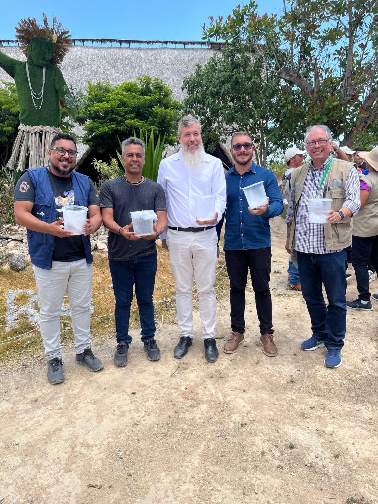A Moscamed Brasil, representada pelo diretor-presidente, Jair Virginio, participou ontem (12), da cerimônia oficial de liberação de mosquitos machos estéreis do Aedes aegypti na Aldeia Pedra D’Água, em Pesqueira (PE). A ação marca um avanço importante nas estratégias de controle de arboviroses em territórios indígenas no país. O evento celebrou a adoção inédita da Técnica do Inseto Estéril (TIE), em comunidades indígenas brasileiras. A iniciativa integra as diretrizes do Ministério da Saúde para reduzir casos de dengue, zika e chikungunya em áreas vulneráveis, por meio da liberação de machos estéreis, que não transmitem doenças e não geram descendentes. A cerimônia contou com a presença de diversas autoridades e lideranças indígenas, entre elas o diretor de Programa da Secretaria de Vigilância em Saúde e Ambiente do Ministério da Saúde, Cassio Peterka; a representante da Coordenação de Vigilância em Saúde Indígena do Ministério da Saúde, Adriana Soares; a coordenadora do Distrito Sanitário Especial Indígena (DSEI-PE), Rosália Ramos; o diretor de Vigilância Ambiental da Secretaria Estadual de Saúde de Pernambuco, Eduardo Bezerra; o representante da Fiocruz, Diogo Chalegre; o Cacique e prefeito de Pesqueira, Marcos Luidson; o representante do Conselho Indígena de Saúde Xukuru, Inaldo Rodrigues; além do Pajé Márcio e outras lideranças locais. A abertura incluiu um ritual tradicional indígena, simbolizando união e respeito aos saberes ancestrais. Durante o evento, foi destacado o pioneirismo da aldeia de Cimbres na adoção da TIE como ferramenta complementar no combate às arboviroses. Ao final, cerca de 50 mil mosquitos machos estéreis foram liberados na área. O diretor-presidente da Moscamed, Jair Virginio, ressaltou a relevância da iniciativa: “Estamos honrados em participar deste momento ao lado do Ministério da Saúde, da Sesai e das lideranças indígenas. A ação representa um avanço significativo no enfrentamento às arboviroses em territórios indígenas”, disse. O Cacique e também prefeito de Pesqueira, Marcos Luidson, reforçou o caráter inovador do projeto: “Vivemos um momento importante para o Brasil e o mundo. Esta é uma iniciativa pioneira que começa em nosso território e pode beneficiar outras áreas indígenas do país”, pontuou. Sobre a Técnica do Inseto Estéril (TIE) A TIE é uma tecnologia segura e eficaz, utilizada internacionalmente, que consiste na liberação de mosquitos machos irradiados, ou seja, estéreis. Ao copularem com fêmeas selvagens, não geram descendentes, contribuindo para a redução gradual da população do Aedes aegypti. A Moscamed Brasil, referência internacional na aplicação da TIE, é responsável pela produção e liberação dos mosquitos estéreis na área indígena.